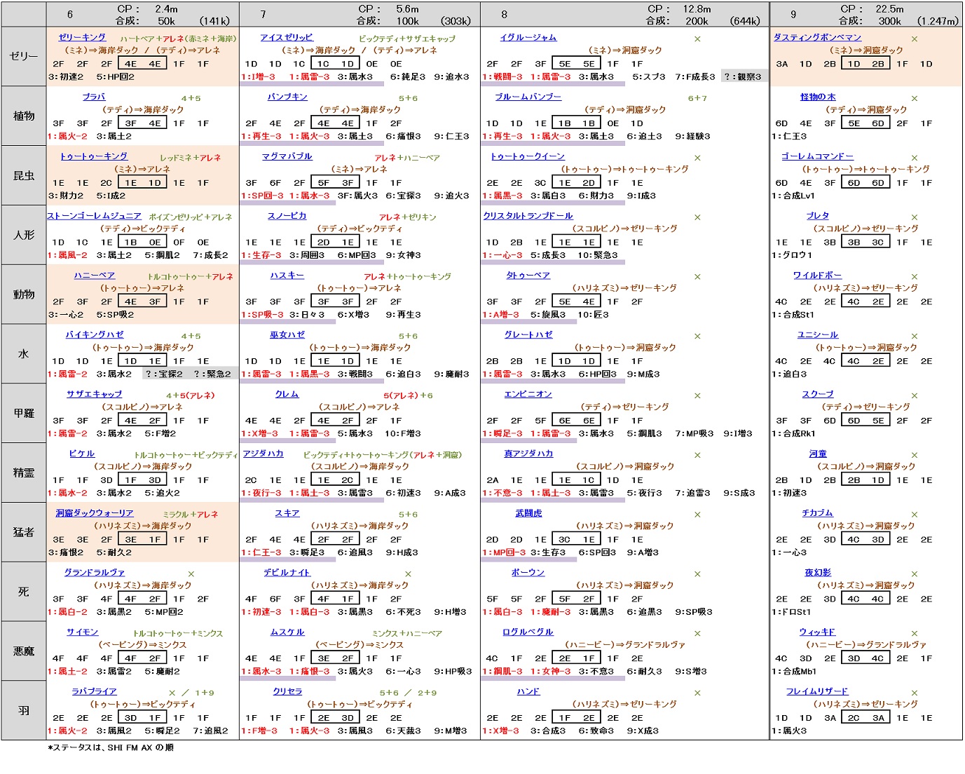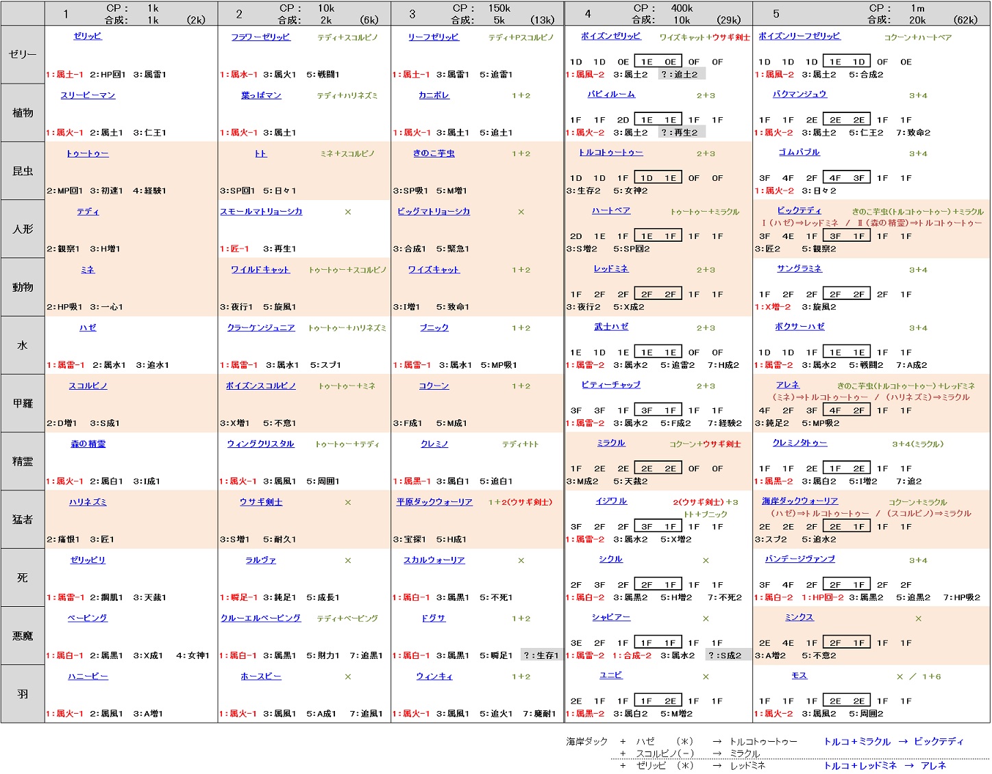 茶色字は、括弧内のモンスターと合成すると、現在のスキル構成のままRankを落とすことが可能な組み合わせ(⇒先が合成先となる)。