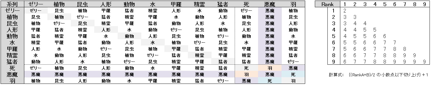 数字は同じ種族のRankを示す(同種同士の組み合わせは必ず同種が作成される)。